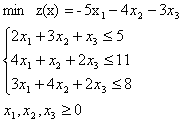 Vì hệ số của x1 trong hàm mục tiêu là âm và có giá trị tuyệt đối lớn nhất nên nếu tăng x1 từ bằng 0 lên một giá trị dương ( càng lớn càng tốt ) và đồng thời vẫn giữ x2 và x3 bằng 0 thì giá trị của hàm của hàm mục tiêu sẽ giảm xuống. Khi đó các biến ở vế trái của bài toán (I) sẽ bị thay đổi theo nhưng phải thoả ≥ 0 . Sự thay đổi của chúng không ảnh hưởng đến sự thay đổi của hàm mục tiêu. Thực hiện ý tưởng trên ta được :