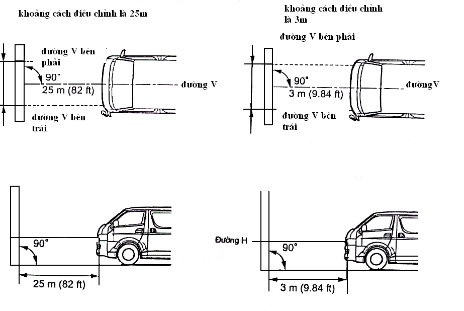 Chú ý: Khoảng cách 25m giữa xe (tâm bóng đèn sương mù) và tường là cần thiết cho việc điều chỉnh độ tụ chính xác. nếu không đủ thì chắc chắn phải có chắc chắn khoảng cách
