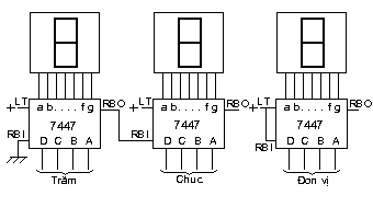 - IC hàng chục có ngã vào RBI nối với ngã ra RBO của IC hàng trăm nên số 0 hàng chục chỉ được hiển thị khi số hàng trăm khác 0 (RBO=1) (dòng 0 đến 15).