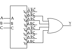 Với hàm 3 biến, ta dùng mạch giải mã 3 đường sang 8 đường. 8 ngã ra mạch giải mã tương ứng với 8 tổ hợp biến của 3 biến, các ngã ra tương ứng với các tổ hợp biến có trong hàm sẽ lên mức 1. Với một hàm đã viết dưới dạng tổng chuẩn, ta chỉ cần dùng một cổng OR có số ngã vào bằng với số tổ hợp biến trong hàm nối vào các ngã ra tương ứng của mạch giải mã để cộng các tổ hợp biến có trong hàm lại ta sẽ được hàm cần tạo.