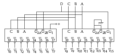 Khi A2=G=0, IC1 giải mã cho 1 trong 4 ngã ra thấp và khi A2=G=1, IC2 giải mã cho 1 trong 4 ngã ra cao