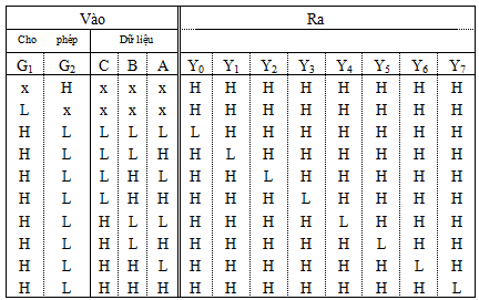 - 74138 là IC giải mã 3 đường sang 8 đường có ngã vào tác động cao, các ngã ra tác động thấp, hai ngã vào cho phép G2A và G2B tác động thấp, G1 tác động cao.