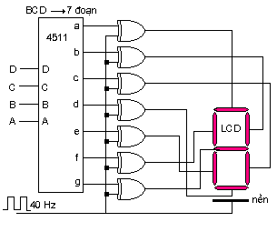 Để hiểu được cách vận chuyển ta có thể dùng IC 4511 kết hợp với các cổng EX-OR để thúc LCD (H 4.15). Các ngã ra của IC 4511 (Giải mã BCD sang 7 đoạn, tác động cao) nối vào các ngã vào của các cổng EX-OR, ngã vào còn lại nối với tín hiệu hình vuông tần số khoảng 40 Hz (tần số thấp có thể gây ra nhấp nháy), tín hiệu này đồng thời được đưa vào nền. Khi một ngã ra mạch giải mã lên cao, ngã ra cổng EX-OR cho một tín hiệu đảo pha với tín hiệu ở nền, đoạn tương ứng xem như nhận được tín hiệu có biên độ gấp đôi và sẽ sáng lên. Với các ngã ra mạch giải mã ở mức thấp,