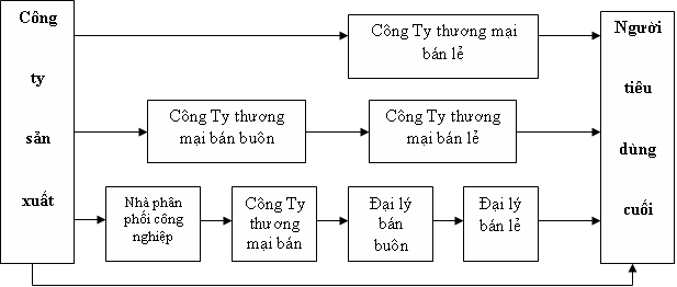 + Kênh ngắn: Trong một số trường hợp, kênh này được tổ chức thực hiện thông qua bán lẻ thuộc Công Ty sản xuất , trường hợp này thường để giới thiệu sản phẩm mới, hoạc đẩy mạnh bán ra hàng chậm luân chuyển với giá hạ hoặc những hàng có quy mô sản xuất nhỏ, chưa có ý nghĩa xã hội lớn.