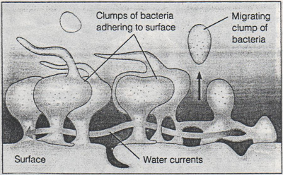 - Dòng nước chuyển động (theo mũi tên từ phải sang trái) giữa các cột nhày được tạo nên do sự sinh trưởng của các vi khuẩn bám trên bề mặt cứng. Điều này cho phép vi khuẩn hấp thụ chất dinh dưỡng và thải bỏ chất thải một cách hiệu quả. Các vi khuẩn riêng lẻ tạo nhầy hoặc các vi khuẩn trong đám nhầy tách khỏi màng sinh học và di chuyển đến nơi khác.