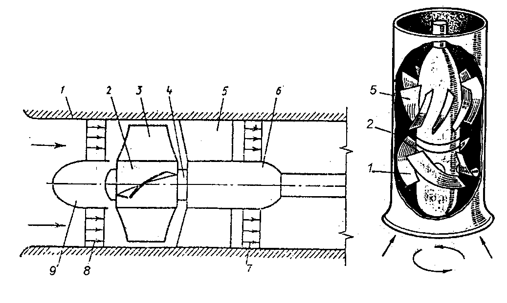 1,6- thân máy bơm và cụm ổ trục ; 2- BXCT; 3- cánh của BXCT; 4- trục; 5- cánh hướng dòng; 7,8- biểu đồ tốc độ dòng chảy v = f ( R ) sau cửa ra cánh hướng dòng và trước cửa vào BXCT; 9- phần lưu tuyến.