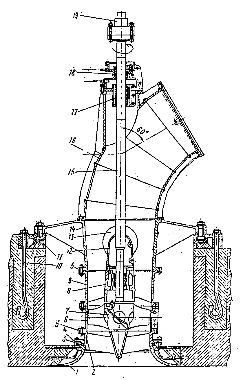 1- vòng đặt; 2- chỉnh hướng; 3- vòng cao su; 4- nắp; 5- buloong; 6,15- thân và trục bơm; 7- BXCT; 8,17- ổ trục hướng dưới và trên; 9- vỏ chứa cánh hướng dọng; 10- bùloong; 11- khung đỡ; 12- bộ phân chảy vòng; 13- nắp quan trắc; 14- nón khuếch tán; 16- đoạn dẫn nước vào ống đẩy; 18- vòng bít; 19- trục động cơ điện.