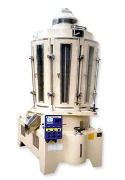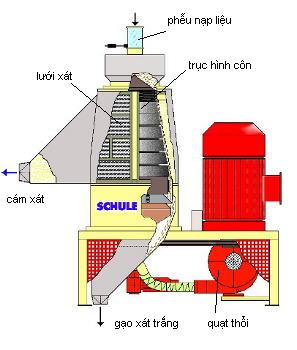 Hạt được đưa vào máy từ phía trên, vào khoảng trống giữa rôto và lưới xát.Trục rôto quay làm lớp hạt tiếp xúc với bề mặt đá nhám bị mài mòn. Khi hạt đi qua khe hở giữa thanh cao su và bề mặt trục, sự mài mòn diễn ra tích cực hơn do hạt chịu lực đàn hồi của thanh cao su ép mạnh về phía mặt đá nhám. Ngoài ra sự chuyển động của cả khối hạt làm tăng sự cọ xát cũng làm lớp vỏ lụa bị mòn nhanh chóng. Như vậy, do ma sát giữa vỏ lụa và trục côn, giữa các hạt với nhau, vỏ lụa mòn và bong ra. Lớp vỏ lụa bị mài mòn gọi là cám gạo có kích thước tương đối mịn. Quạt hút cám, hút không khí ngang lớp hạt, xuyên qua lưới mang theo cám gạo, và làm nguội khối hạt xát. Do trục xát đặt thẳng đứng, hạt có khuynh hướng di chuyển xuống phía dưới và thoát ra ngoài theo cửa thoát. Ðể thay đổi độ trắng hạt sau khi xát, người ta thay đổi diện tích của thoát để tăng thời gian lưu lại trong máy của hạt. Tuy nhiên khi tăng độ trắng làm giảm năng suất làm việc của máy.