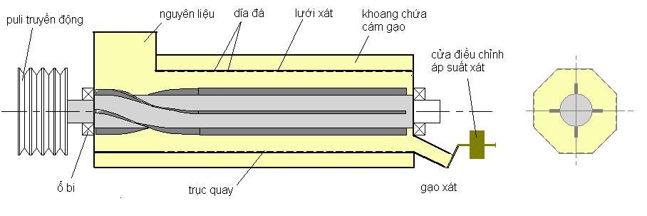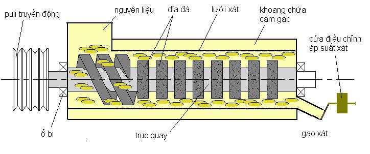 Hạt được cho vào khoang xát giữa lưới và dĩa đá. Dĩa đá quay làm khối hạt chuyển động. Khi qua ngang khoảng hở nhỏ giữa thanh cao su, hạt tiếp xúc mạnh với bề mặt lớp đá nhám, làm mòn lớp vỏ lụa bên ngoài hạt. Ngoài ra tác động tự mài mòn khi ma sát giữa hạt với hạt cũng có tác động đáng kể tới quá trình xát trắng hạt.