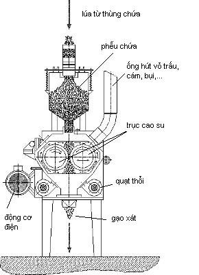 Khi cho hạt đi vào khe hở giữa 2 trục, nửa vỏ hạt tiếp xúc trục quay chậm, nửa vỏ kia tiếp xúc trục quay nhanh, làm sinh ra một lực dịch trượt xé rách vỏ trấu và tách rời khỏi nhân hạt. Quá trình tách vỏ nầy xảy ra rất nhanh trong khe hở nhờ ma sát lớn giữa hạt và bề mặt cao su giúp giảm được hiện tượng trượt. Nhờ sự biến dạng của cao su nên những hạt có kích thước lớn có thể được tách vỏ mà vẫn không bị gãy.