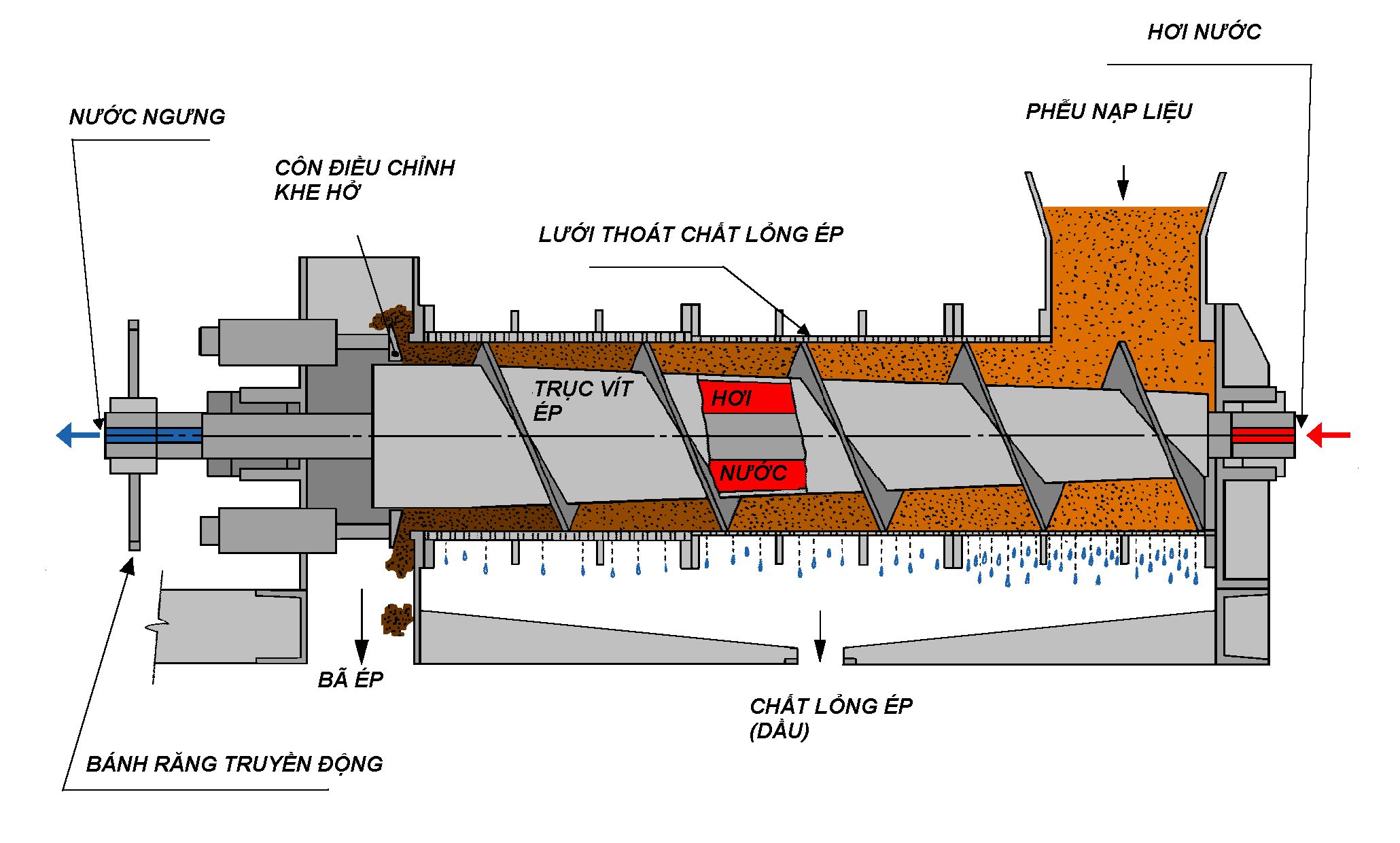 Dùng ép dầu ra khỏi các hạt có dầu. Nguyên tắc làm việc của máy ép trục vít là sử dụng 1 vít để ép nguyên liệu. Vít có hình dạng đặc biệt, lòng ép cũng được thiết kế có hình dạng đặc biệt sao cho thể tích rỗng giữa lòng ép và trục ép càng về sau càng nhỏ. Lòng ép là một ống hình trụ ghép lại bằng nhiều thanh rời gọi là thanh căn, ngay giữa 2 thanh căn là khe hở nhỏ để dầu có thể chảy ra được. Nguyên liệu cho vào máy ép bị nén dần về phía cuối máy, càng về sau thể tích khoang ép càng nhỏ, áp suất sẽ tăng, dầu sẽ thoát ra khỏi nguyên liệu theo khe hở thanh căn chảy ra ngoài ở phía dưới, bã sẽ thoát ra ở cuối lòng ép. Cuối lòng ép có bộ phận hình côn điều chỉnh khe hở ra (côn điều chỉnh). Nếu khe hở lớn, áp suất ép nhỏ và ngược lại.