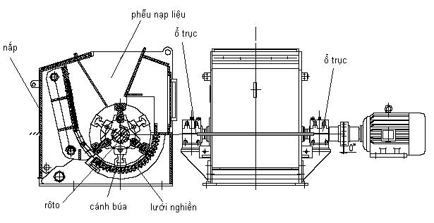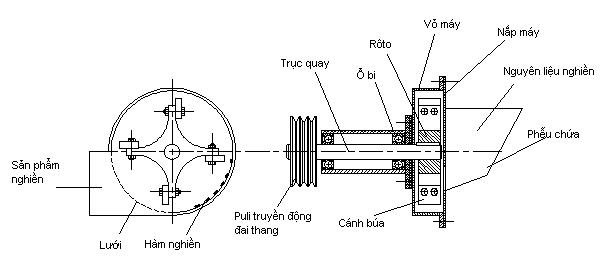 Nguyên liệu cần nghiền cho vào bên trong máy qua của nạp liệu. Do sự va đập của vật liệu với các cánh búa đang quay và với thành trong của máy, vật liệu sẽ biến dạng rồi vỡ ra thành các thành phần có kích thước nhỏ hơn. Ngoài ra khi nguyên liệu ban đầu có kích thước lớn, còn có thêm sự chà xát của vật liệu với thành trong của máy. Do bị va đập nhiều lần giữa cánh búa và vỏ máy, nguyên liệu giảm kích thước đến khi nhỏ hơn lỗ lưới, hạt sẽ theo lỗ lưới ra ngoài.Các hạt vật liệu nhỏ lọt qua lưới tự thoát ra ngoài hoặc được quạt hút ra khỏi máy, còn các hạt vật liệu to chưa lọt qua lưới lại được các búa tiếp tục nghiền nhỏ. Ðể nghiền được, động năng của búa khi quay phải lớn hơn công làm biến dạng để phá vỡ vật liệu. Do vậy, khi nghiền vật liệu lớn cần có trọng lượng búa lớn, còn khi nghiền vật liệu nhỏ cần búa nhẹ hơn. Trong trường hợp vật liệu nghiền kích thước không đều hoặc quá cứng, người ta dùng loại có cánh búa xếp. Ưu điểm của cánh búa loại này là có thể xếp được khi qua tải hoặc vật cứng; khi vượt qua tải hay vật cứng này, cánh búa sẽ mở ra nhờ lực ly tâm.