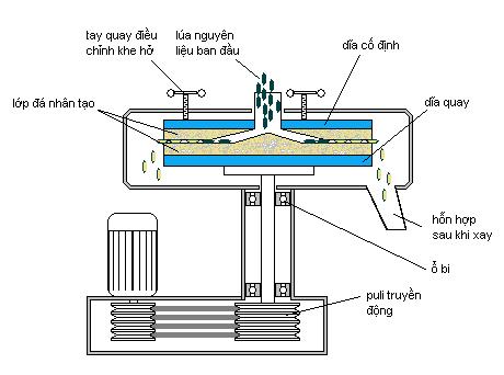 Hạt vào lỗ nhập liệu của dĩa trên, đi vào khe hở giữa 2 dĩa đá. Do kích thước khe hở nhỏ hơn đường kính hạt nên vỏ trấu chịu lực nén từ 2 phía của dĩa đá, đồng thời do tác động quay của dĩa làm hạt lăn trong khe, vì vậy vỏ trấu bị vỡ và tách hoàn toàn khỏi nhân hạt. Rãnh trên mặt đá giúp hạt tách vỏ nhanh hơn và di chuyển ra ngoài dễ dàng hơn nhờ tác dụng của lực ly tâm. Hỗn hợp sau khi xay gồm có nhân hạt, vỏ trấu và một tỉ lệ nhất định hạt (15-20 %) còn chưa xay được. Vỏ trấu và hạt chưa xay được sẽ được tách ra, nhân hạt đưa vào chế biến tiếp.