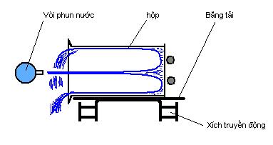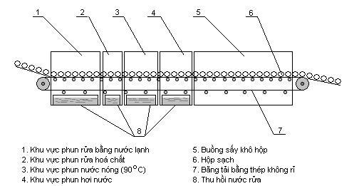 Máy rửa hộp sắt kiểu băng chuyền gồm một hệ thống băng tải bằng thép không rỉ và các buồng phun nước lạnh, buồng phun nước nóng, buồng phun hơi nước, buồng sấy hộp. Băng tải mang hộp nằm ngang di chuyển lần lượt qua các buồng. Bên trong buồng có các vòi phun nước hoặc hơi nước được bố trí dọc hai bên thành của băng chuyền. Các vòi phun được bố trí thành hàng liên tiếp nhau nhờ đó hộp được phun nhiều lần trong suốt thời gian di chuyển trong mỗi buồng. Hộp lần lượt được phun nước lạnh, nước nóng, hơi nước và sau đó sấy khô bằng không khí nóng. Bụi bẩn sẽ được mang ra theo dòng nước. Trong buồng sấy khô, một hệ thống quạt thổi không khí nóng làm khô hộp trong khi di chuyển. Ðể tiết kiệm nước, thông thường các máy rửa có hệ thống lọc nước đã sử dụng, chỉ bổ sung thêm phần hao hụt.