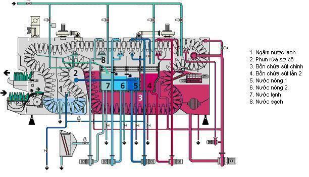 Nước và dung dịch sút trong máy được lọc để tái sử dụng nhằm tiết kiệm nước và hoá chất. Nhiệt độ được duy trì nhờ các ống gia nhiệt bằng hơi nước lắp phía dưới đáy.