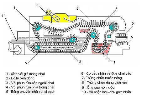Máy rửa chai thủy tinh gồm có 2 sợi xích thép chạy song song nhau. Các giá giữ chai bằng thép nối giữa 2 sợi xích sẽ làm cho cả hệ thống xích-giá giữ chai di chuyển. Xích chạy vòng trong máy đi qua các thùng chứa nước và dung dịch hoá chất theo một trong hai cách: di chuyển từng nấc: di chuyển-dừng-di chuyển hoặc di chuyển liên tục với vận tốc không đổi.