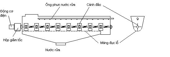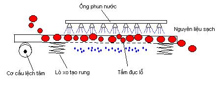 Để rửa các loại nguyên liệu tương đối cứng, có thể dùng máy rửa kiểu sàng. cấu tạo của máy rửa kiểu sàng gồm có một sàng đục lỗ, thường làm bằng thép không rỉ, được nối với cơ cấu truyền động làm cho sàng có chuyển động tịnh tiến. Phía trên sàng có bố trí các vòi phun nước rửa. Thông thường sàng được đặt nghiêng một góc đủ để nguyên liệu có thể di chuyển từ đầu nầy đến đầu kia của sàng. Nguyên liệu ban đầu được cho vào ở đầu cao của máy rửa kiểu sàng. Do chuyển động của sàng, nguyên liệu sẽ tiếp xúc với bề mặt sàng đồng thời với nước xối từ trên làm các chất bẩn bám trên bề mặt nguyên liệu bị thấm ướt và tách ra. Nước bẩn theo các lỗ trên sàng rơi xuống máng hứng phía dưới và được tháo ra ngoài. Với lượng nước sử dụng đủ, thời gian lưu lại trên sàng càng lâu, nguyên liệu rửa càng sạch.