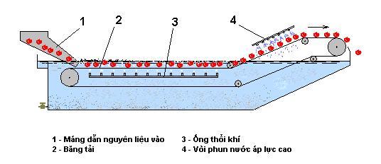 Tùy thuộc loại nguyên liệu và mức độ bẩn, có thể điều chỉnh tốc độ di chuyển của băng chuyền cho phù hợp. Nếu nguyên liệu quá bẩn, cho băng chuyền đi chậm lại, làm tăng thời gian rửa. Ngược lại, nếu cặn bẩn bám trên ngoài nguyên liệu ít, có thể cho băng chuyền đi nhanh hơn nhằm tăng năng suất quá trình. Nước sạch từ vòi phun vào thùng ngâm sẽ bổ sung nước cho hệ thống, còn cặn bẩn được tháo ra liên tục qua van xả và nước thừa theo máng chảy tràn ra ngoài.