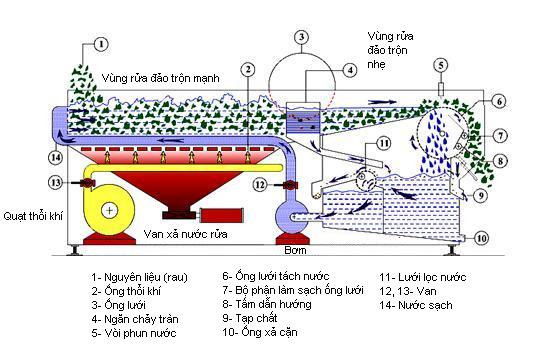 Máy rửa thổi khí gồm hai ngăn có đáy hình phễu, ngăn thứ nhất lớn, ngăn thứ hai nhỏ hơn, chứa đầy nước. Trong ngăn thứ nhất có dàn ống thổi khí mạnh lắp phía dưới, ngăn cách giữa ngăn thứ nhất và thứ hai có ống lưới quay, cuối ngăn thứ hai có ống lưới quay thứ hai. Khi làm việc, không khí từ dàn ống thổi khí nổi lên làm xáo trộn rất mạnh nước trong ngăn thứ nhất. Nguyên liệu nổi trong nước như rau, trái cây nhỏ cho vào ở đầu ngăn thứ nhất. Nước xáo động mạnh làm các chất bẩn nhanh chóng hút nước, bở tơi và tách ra khỏi bề mặt nguyên liệu.Ống quay thứ nhất đưa nguyên liệu sang ngăn thứ hai, tại đây nước không bị xáo động nhiều nên các chất bẩn còn bám trên nguyên liệu sẽ tách ra hoàn toàn và lắng xuống đáy hình phễu của ngăn. Cuối máy, nguyên liệu được ống lưới quay thứ hai vớt lên và chuyển ra ngoài. Nguyên liệu còn được phun nước sạch rửa lần cuối trườc khi rơi ra khỏi ống lưới thứ hai. Nước từ các ngăn được lọc và bơm trở lại ngăn đầu sử dụng lại. Cặn lắng chủ yếu ở ngăn đầu được xả ra ngoài.