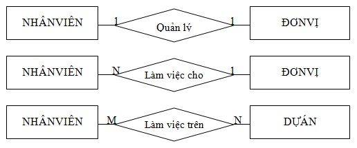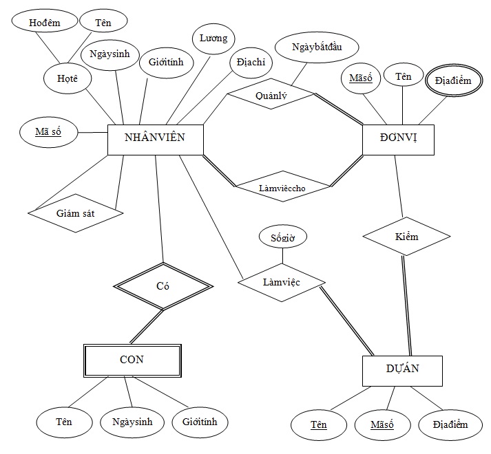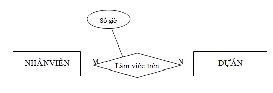 10. Kiểu liên kết NHÂNVIÊN <làm việc trên> DỰÁN là có tỷ số lực lượng là M:N (một nhân viên có thể làm việc trên nhiều dự án khác nhau và mỗi dự án có nhiều nhân viên làm việc). Sự tham gia của kiểu thực thể NHÂNVIÊN là bộ phận (bởi vì không phải tất cả nhân viên đều làm việc trên dự án) ngược lại, sự tham gia của kiểu thực thể DỰÁN là toàn bộ (bởi vì dự án nào cũng phải có nhân viên làm việc). Kiểu liên kết này có một thuộc tính là Sốgiờ, ghi lại số giờ làm việc của một nhân viên trên một dự án.
