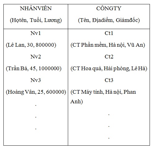 Các kiểu thực thể và các tập thực thể: Một cơ sở dữ liệu thường chứa những nhóm thực thể như nhau. Ví dụ, một công ty thuê hàng trăm nhân viên và lưu giữ những thông tin tương tự liên quan đến mỗi nhân viên. Các thực thể nhân viên này chia sẻ các thuộc tính giống nhau nhưng mỗi thực thể có các giá trị riêng cho các thuộc tính đó. Một kiểu thực thể là một tập hợp các thực thể có các thuộc tính như nhau. Một kiểu thực thể trong cơ sở dữ liệu được mô tả bằng tên và các thuộc tính. Vídụ: NHÂNVIÊN (Họtên, Tuổi, Lương), CÔNGTY (Tên, Địađiểm, Giámđốc). Một tập hợp các thực thể của một kiểu thực thể cụ thể trong cơ sở dữ liệu tại một thời điểm được gọi là một tập thực thể, nó thường được tham chiếu đến bằng cách sử dụng tên của kiểu thực thể. Ví dụ, NHÂNVIÊN vừa dùng để chỉ một kiểu thực thể, vừa để chỉ tập hợp hiện tại của tất cả các thực thể nhân viên trong cơ sở dữ liệu. Hình 2-2 minh họa các kiểu thực thể NHÂNVIÊN, CÔNGTY và các tập thực thể tương ứng.