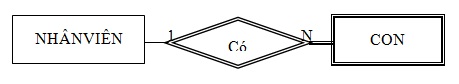 11. Kiểu liên kết NHÂNVIÊN <có> CON biểu thị mối liên hệ giữa kiểu thực thể NHÂNVIÊN và kiểu thực thể CON (một nhân viên có thể có những người con). Kiểu liên kết này có tỷ số lực lượng 1:N (một nhân viên có thể có nhiều người con nhưng mỗi con là con của chỉ một nhân viên). Sự tham gia của kiểu thực thể NHÂNVIÊN là bộ phận (không phải nhân viên nào cũng có con), ngược lại, sự tham gia của kiểu thực thể CON là toàn bộ (người con nào cũng phải là con của một nhân viên). Ngoài ra, kiểu thực thể CON là một kiểu thực thể yếu.