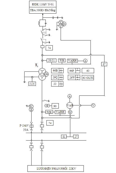 | 33 : Bảo vệ mức dầu MBA giảm thấp - 2 cấp | A, V : Ampemet, Vônmet |