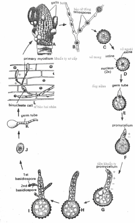 Khuẩn ty nhị nhị bội ở trên bắp tiếp tục nẩy chồi trên trái bắp tạo thành các khối u (hình 5.10), khi các khuẩn ty thứ cấp phát triển các đãm bào tử đông hình thành với các dạng cầu, tròn vách dầy, hai nhân đơn bội hợp thành một nhân nhị bội sau đó các bào tử này nẩy mầm cho ra một ống dài gọi là TIỀN KHUẨN TY (promycelium), nhân nhị bội di chuyển vào trong tiền khuẩn ty và phân chia thành 4 nhân đơn bội, nhân của mổi tế bào tiền khuẩn ty phân chia thành 2 nhân con, một đi vào chồi bên cạnh và một vẩn còn ở lại tế bào chủ, chồi sẽ phát triển thành đãm bào tử, còn nhân trong tế bào chủ tiếp tục phân chia cho chồi thứ hai, thứ ba..... Đãm bào tử tròn, bầu dục, vỏ mỏng chứa một nhân đơn bội và khi nẩy mầm cho một khuẩn ty đơn bội.