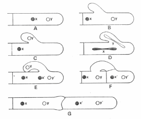 - Nhân Y vừa phân chia trong mấu và nhân X’ vừa được phân chia tiến về phiá nhân Y’, nhân Y trong mấu tiếp hợp với nhân X.