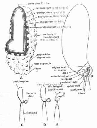 8. Đặc tính bào tử là những đãm bào tử, chúng phát triển một ĐÃM, đãm có thể không có vách ngăn ngang (holobasidia) hay có vách ngăn ngang (phragmobasidia), luôn luôn có 4 bào tử đãm trong một đãm, mỗi đãm bào tử có một nhân và nẩy mầm ngay trong khuẩn ty đầu tiên.