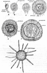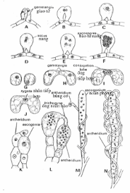 Khuẩn ty chứa những tế bào đơn nhân phát triển thành túi noãn đơn nhân, túi noãn kéo dài và phân chia nhiều lần để cho ra khoảng 64 nhân, đồng thời, một túi đực cũng phát triển và quấn lấy túi noãn đa nhân đó (hình 4.13).