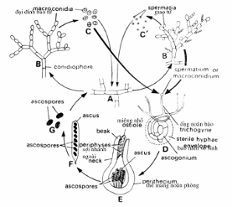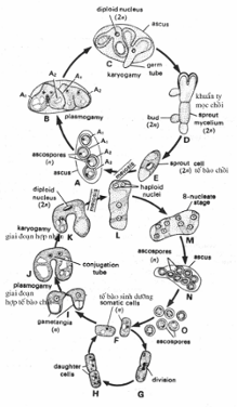 Đây là loài nấm đồng tán, tế bào dinh dưỡng là đơn bội và phân đôi thành 2 tế bào con (hình 4.8), mỗi tế bào đơn bội là tế bào giao tử và sinh sản hữu tính xảy ra với hai tế bào tiến gần lại nhau và mọc ra một chối (producrance) và tiếp xúc với nhau tạo thành một đường hay một ống thông với nhau gọi là ống tiếp hợp (conjugation tube) hay kênh tiếp hợp (conjugation canal), nhân của hai tế bào giao tử di chuyển vào trong ống này và tiến hành tiếp hợp tại đây rồi hình thành nhân nhị bội, tế bào chất của hai giao tử này hợp nhau thành tế bào tiếp hợp sau đó tạo thành một nang. Nhân tế bào hợp tử phân chia lần đầu là giảm phân để thành 4 nhân đơn bội rồi tiếp đến là phân chia thành 8 nhân và 8 nhân này thành 8 bào tử nang và chu kỳ sinh trưởng hoàn tất.
