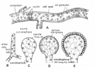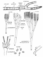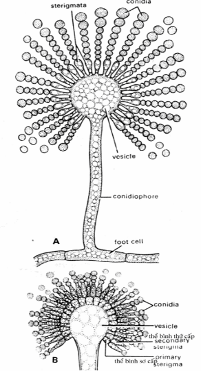 Khuẩn ty hình thành một cọng mang túi bào tử (conidiophore) và bào tử đính (conidia)(hình 4.10) với cọng mang túi bào tử không vách ngăn và không xuất phát từ tế bào chân (foot cell). Túi hay bọng (vesicle) là tế bào đa nhân và phát triển bề mặt gắn liền với thể bình (phialide hay sterigmata). Thể bình với bậc 1 hay bậc 2, mỗi thể bình là cấu trúc đa nhân và trên đầu thể bình tạo thành một chuổi bào tử đính, những bào tử non ở trong và càng xa càng già; bào tử trưởng thành sẽ phóng thích vào không khí và nẩy mầm.