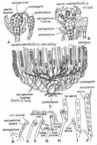 Đầu của hùng cơ đâm xuyên vào noãn phòng, cùng lúc noãn phòng thành lập vách ngăn để chia ra từng tế bào chứa hai nhân, nhân của noãn phòng sinh sản nhiều trong hùng cơ (điều này cho thấy hùng cơ phát triển nhiều nhưng vẩn không có tác dụng); Từ những tế bào nhị bội của noãn phòng phát triển thành sợi noãn, nhân trong sợi noãn phân cắt và hình thành nhiều nang bên trong. Nhiều tác giả không quan sát quá trình thực sự hợp nhân và giảm phân nhưng hai nhân của mỗi noãn phòng phải hợp lại thành tế bào nhị bội trong các nang và nhân tiếp hợp này phải trải qua giai đoạn giảm phân để tạo thành 8 nang bào tử trong mỗi nang; Nang có hình gần tròn và vách nang sẽ vở để phóng bào tử nang nằm trong Tử nang cầu, mỗi bào tử nang nẩy mầm cho ra một khuẩn ty mới.