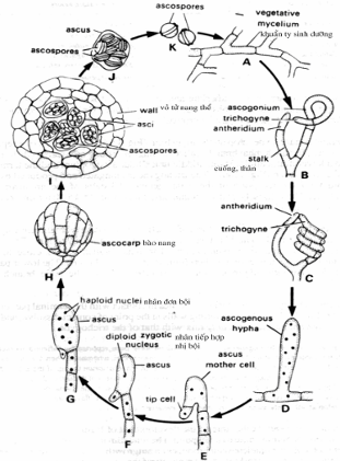 Đồng thời có nhiều nhân kép trong một túi noãn và vách của túi noãn ngày càng phát triển chiều dài và chiều đứng gọi là khuẩn nang (ascogenous hyphae)(hình 4.2B) và những kép di chuyển vào các khuẩn nang này, các khuẩn nang phát triển dần dần (hình 4.2C) trong đó những tế bào mang 2n NST (một từ hùng khí và một từ noãn bào), phát triển thành cuống, từ đây các nang bắt đầu tạo thành ở đầu cuống với các tế bào mang n NST hình thành từ sự tách đôi của nhân kép (hình 4.2D – J) để tạo ra các bào tử nang (ascospore) chứa trong các nang (ascus).
