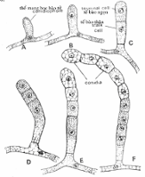 Khuẩn ty phân nhánh, có vách ngăn ngang hoàn chỉnh (hình 4.9), nhiều khuẩn ty phát triển trên bề mặt cơ chất để hấp thu chất dinh dưỡng; đặc biệt ở vách ngăn ngang có một lổ nhỏ để cho tế bào chất thông thương qua lại giữa hai tế bào; Khuẩn ty đứt thành khúc và mỗi khúc hay đoạn có thể phát triển cho ra một khuẩn ty mới.