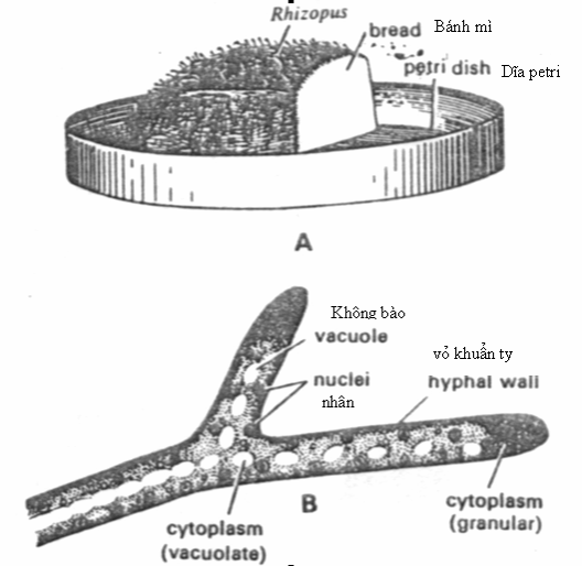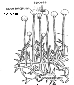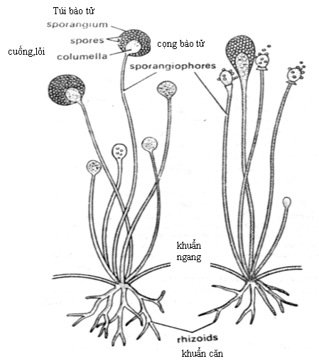: khuẩn căn (rhizoids), khuẩn ngang (stolon) và cọng mang túi (bọc) bào tử (sporangiophores)(hình 3.2).