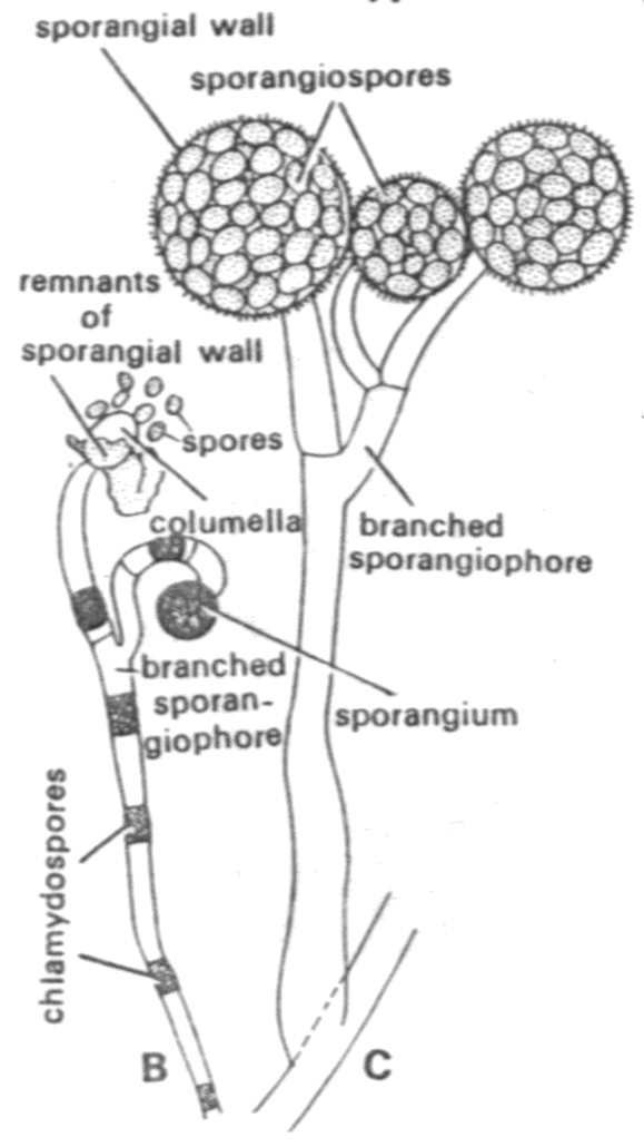 - Cọng mang bọc bào tử với những bào tử bất động hình thành trong cái bao hay bọc bào tử (sporangia); mỗi bọc bào tử phát triển tận ngọn, không phân nhánh và cọng mang bọc bào tử phát triển riêng biệt, không cùng nhóm (hình 3.6) nhiều khi có nhiều loài cá biệt có thể mang bọc bào tử phân nhánh như Mucor racemosus (hình 3.7) và Mucor plumbeus.