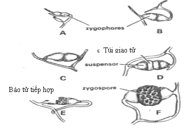- Sinh sản hữu tính với sự phân chia giao tử (2 giao tử phát triển từ khuẩn ty khác nhau). Hai giao tử hợp nhau thành bào tử có vách dày gọi là bào tử tiếp hợp (zygospore) nên gọi là lớp nấm tiếp hợp (lớp Zygomycetes). Bào tử tiếp hợp chống chịu sự khô hạn và những yếu tố bất lợi của môi trường; vỏ bào tử có màu đặc trưng ở nhiều loài nấm nhất định.