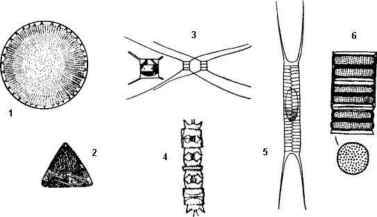 1 Stephanodiscus astrea, 2 Triceratium distinctum, 3 Chaetoceros muelleri, 4 Biddulphia aurita, 5 Attheya zachariasii, 6 Melosira distans