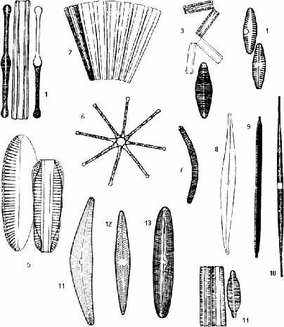 10 Synedra acus, 11 Cymbella lanceolata, 12 Navicula radiosa,