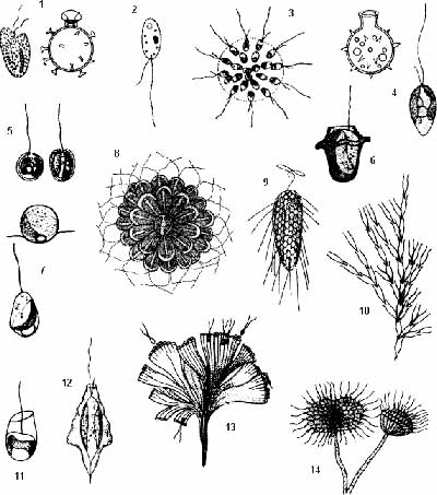 1 Ochromonas fragilis, 2 Monas elongata, 3 Uroglena americana, 4 Ochromonas ludibunda, 5 Chrysococcus rufescens, 6 Stenokalyx monilifera, 7 Chromulina rosanoffii, 8 Synura uvella, 9 Mallomonas fastigata, 10 Dinobryon divergens, 11 Kephyrion ovum, 12 Pseudokephyrion pulcherrimum,