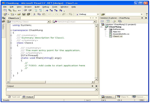 Cuối cùng, Visual Studio .NET tạo một khung sườn chương trình, và kết thúc với chú thích TODO là vị trí bắt đầu của chúng ta. Để tạo chương trình chào mừng trong minh họa trên, ta bỏ tham số string[] args của hàm Main() và xóa tất cả các chú thích bên trong của hàm. Sau đó nhập vào dòng lệnh sau bên trong thân của hàm Main()