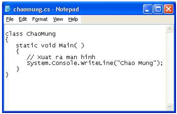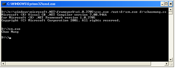 Sau khi viết xong chúng ta lưu dưới dạng tập tin có phần mở rộng *.cs (C sharp). Sau đó biên dịch và chạy chương trình. Kết quả là một chuỗi “Chao Mung” sẽ xuất hiện trong màn hình console.