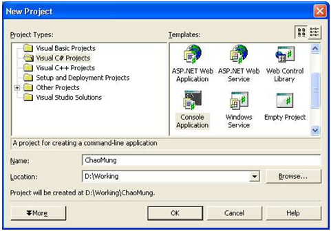 Để tạo chương trình chào mừng trong IDE, lựa chọn mục Visual Studio .NET trong menu Start hoặc icon của nó trên desktop, sau khi khởi động xong chương trình, chọn tiếp chức năng File New Project trong menu. Chức năng này sẽ gọi cửa sổ New Project (hình 2.4 bên dưới). Nếu như chương trình Visual Studio .NET được chạy lần đầu tiên, khi đó cửa sổ New Project sẽ xuất hiện tự động mà không cần phải kích hoạt.