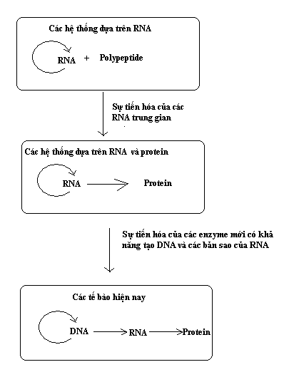Như vậy, trong một thời gian dài, vật liệu di truyền của các tiền sinh vật là RNA và sự tiến hóa dần đến chổ DNA mạch kép ổn định hơn mang thông tin di truyền. và khả năng xúc tác được chuyển cho protein làm chức năng chuyên hóa hữu hiệu hơn.