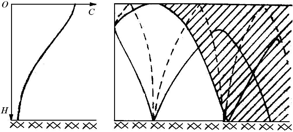 Khi nguồn phát nằm trong lớp građien âm âm (hình 8c), biên vùng tối được tạo nên bởi tia bị tách trên biên dưới của lớp građien dương. Trong vùng tối sự truyền âm sẽ xảy ra chỉ do các tia nhóm 1 bị phản xạ nhiều lần (các tia nét đứt), sự suy yếu cường độ âm xảy ra mạnh như trong khúc xạ trừ.