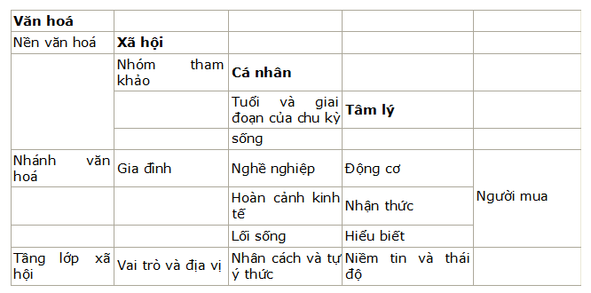 Các yếu tố văn hóa có ảnh hưởng sâu rộng nhất đến hành vi của người tiêu dùng. Ta sẽ xem xét vai trò của nền văn hóa, nhánh văn hóa và tầng lớp xã hội của người mua.