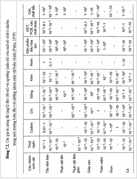 Trong bảng 7.3 trình bày những giá trị NĐTHCP của một số chất độc phổ biến, được rút ra dựa trên những cách tiếp cận sinh hóa học và sinh thái - độc tố học.