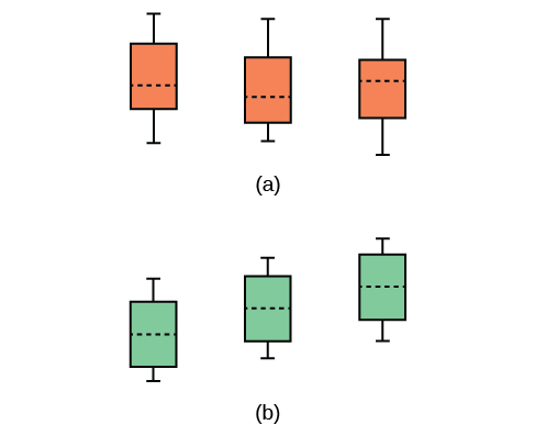 The graphs, a set of box plots representing the distribution of values with the group means indicated by a horizontal line through the box, help in the understanding of the hypothesis test. In the first graph (red box plots), H0: μ1 = μ2 = μ3 and the three populations have the same distribution if the null hypothesis is true. The variance of the combined data is approximately the same as the variance of each of the populations.